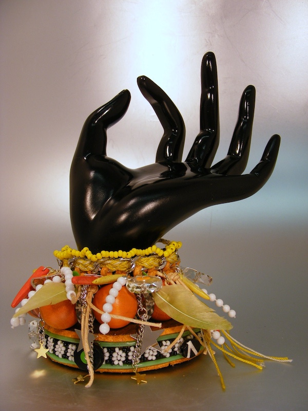 Bracelet stack composed of assorted bangles and friendships bracelets made from feathers, neon sequins, bone, leather, seed beads, Hellenic gilt chain, rock crystal and vintage diamante.
