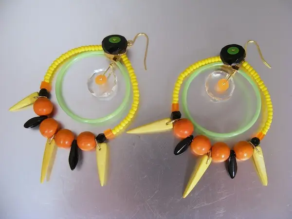 Statement bug clip on earrings made from; ostrich feather, leather, agate, dyed bone, glass beads, metallic pearls, thread and vintage diamante.