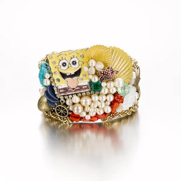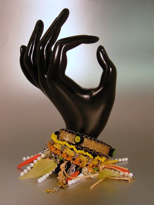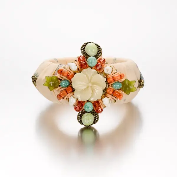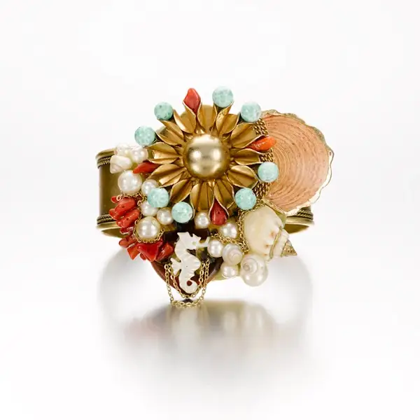 Signature wristy made from; tarnished metals, chain tattered fabrics, coral, turquoise, pearls, shell, nautical motifs and exotic florals.