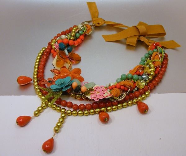 Signature woven strand necklace made from; metallic pearl, glazed ceramic teardrops, swarovski elements, enamel sprayed chain and metal parts finished with a vintage grosgrain ribbon tie clasp